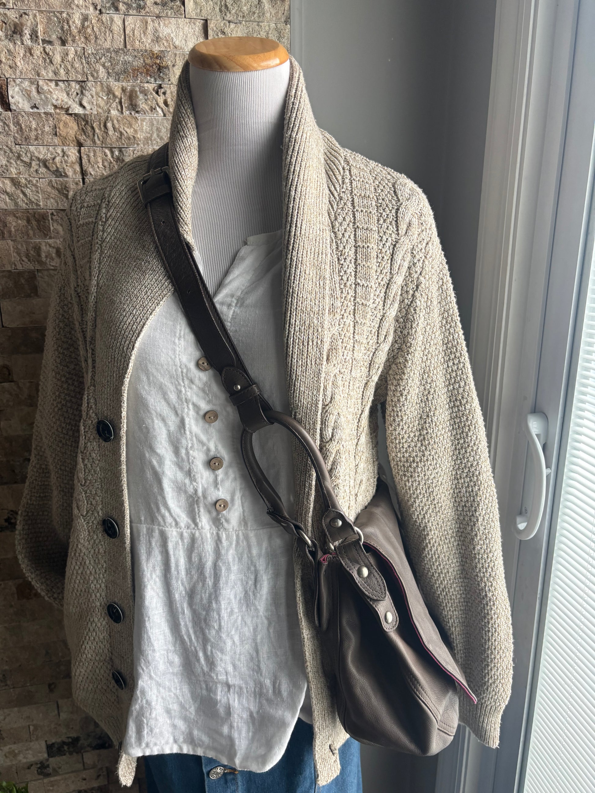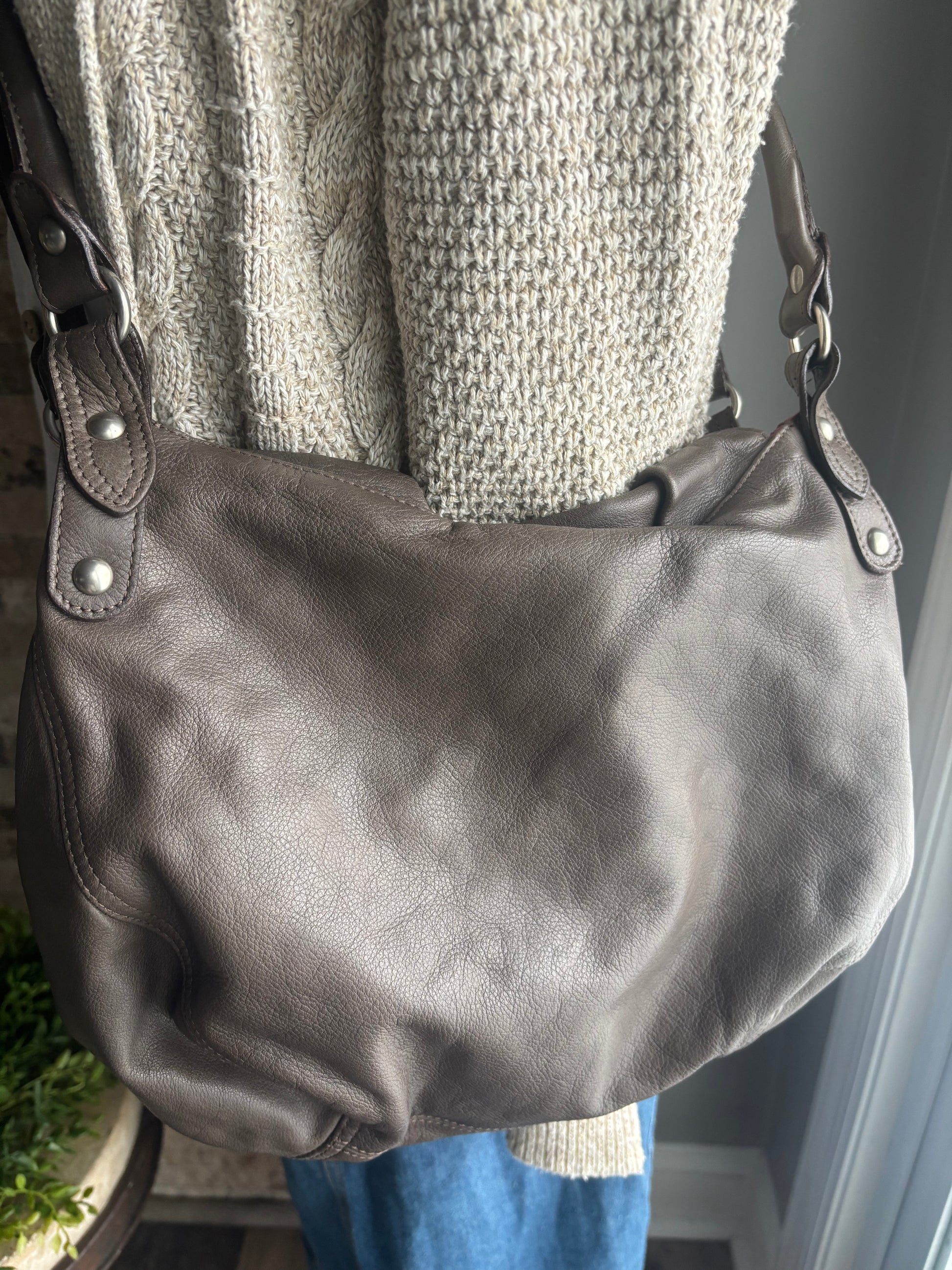 Gorgeous leather beige gray handbag with beautiful accents