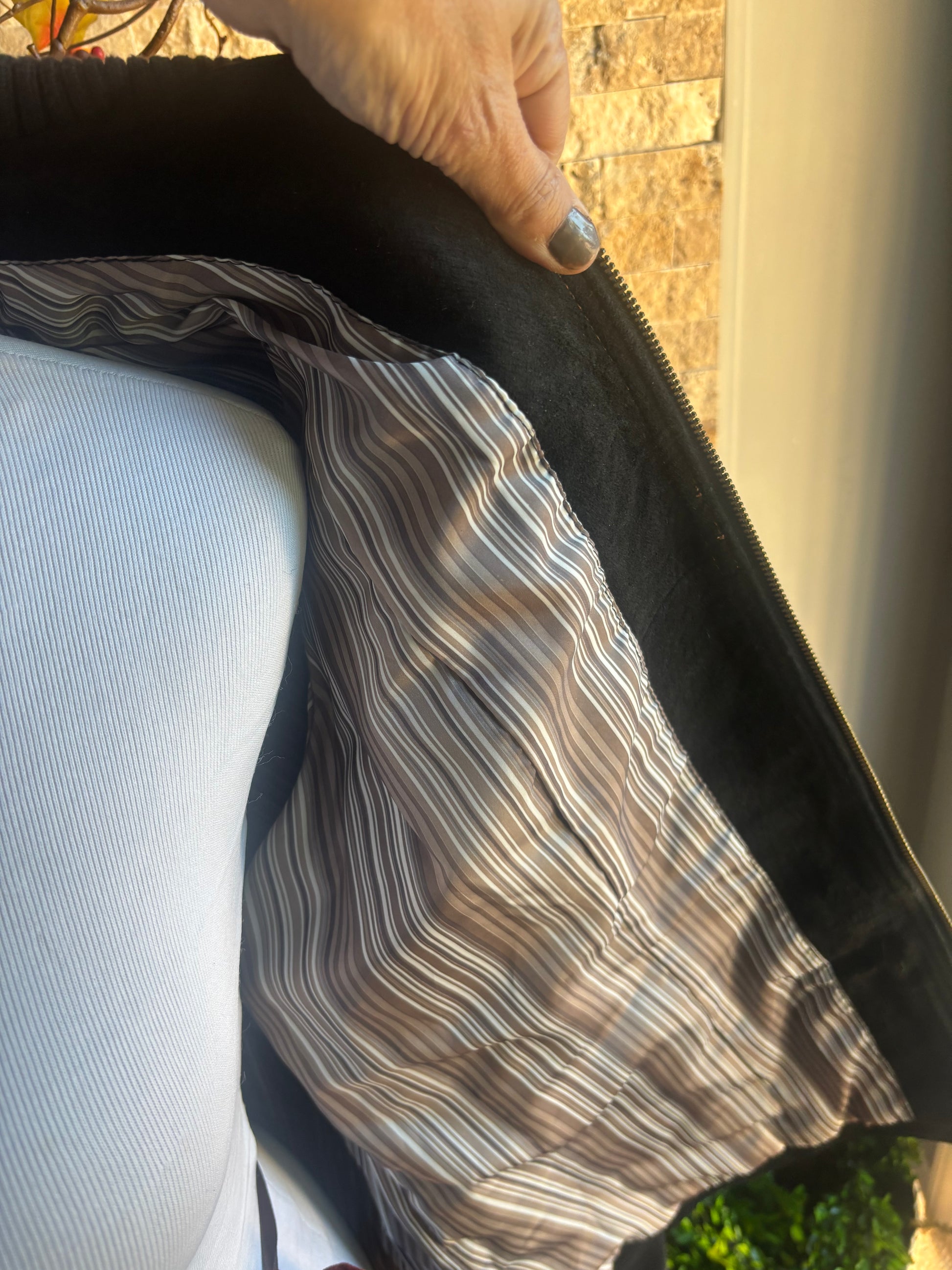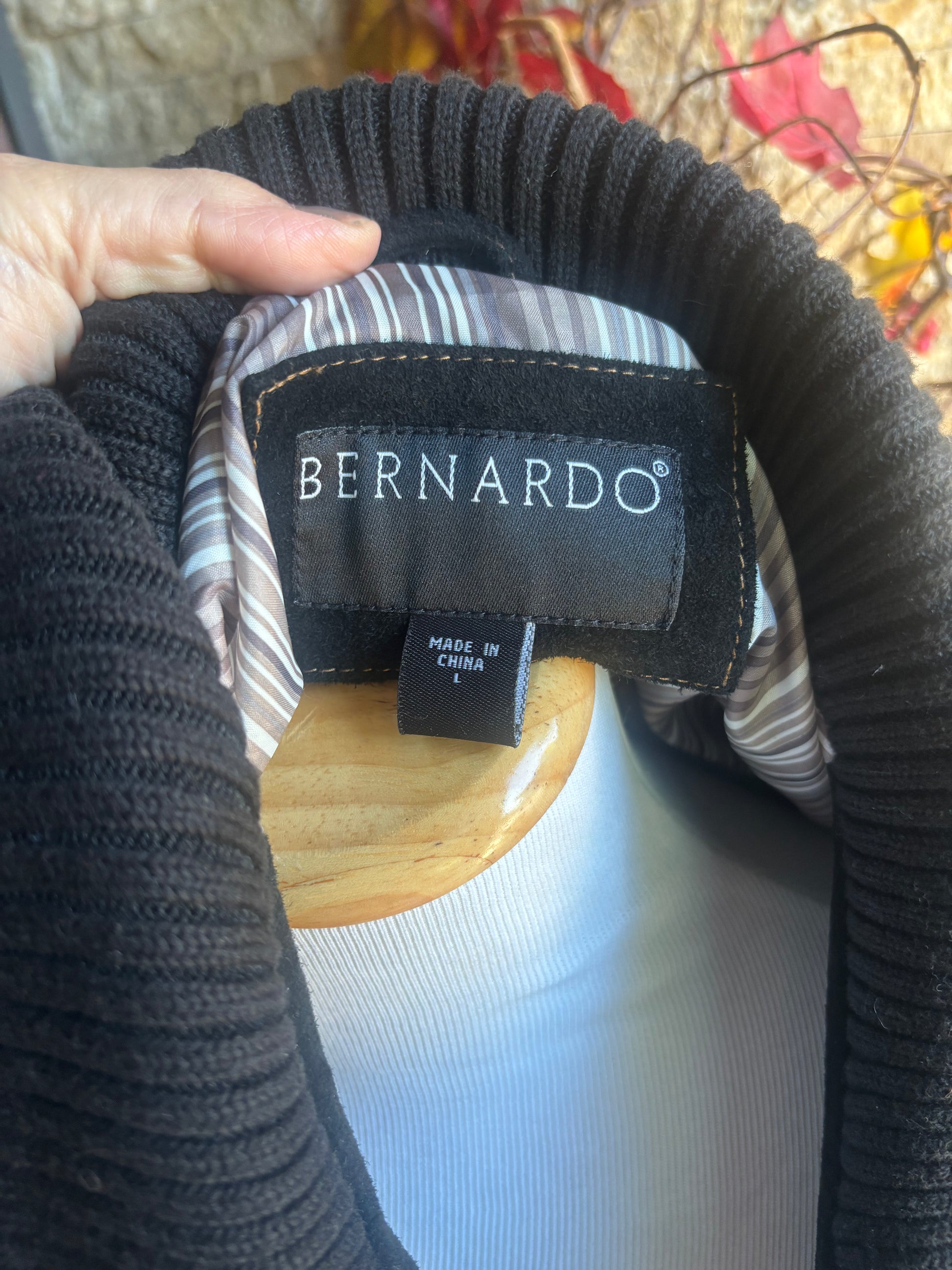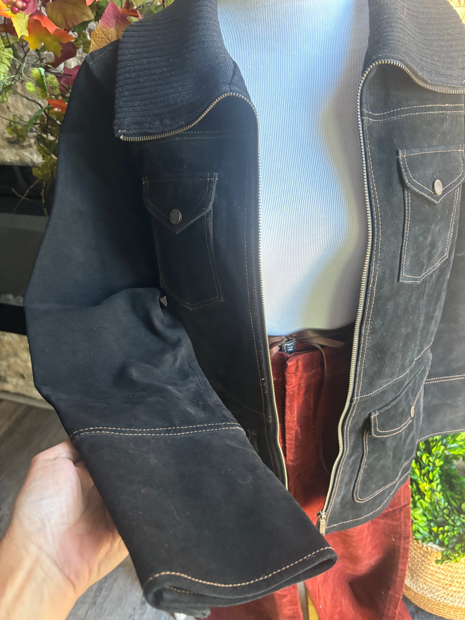 This jacket features a heavy suede body and ribbed knit sleeves and oversized collar for a stylish sleek look